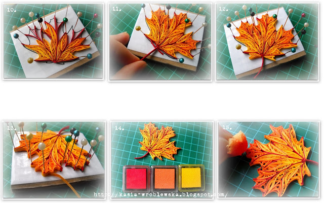 10. Из полосочек динною 6-12 см формируем роллы, а из них делаем "глазики", "капельки", "треугольнички", т. е. все те формы, которые могут между жилками листа поместиться и так постепенно заполняем всю пластинку.